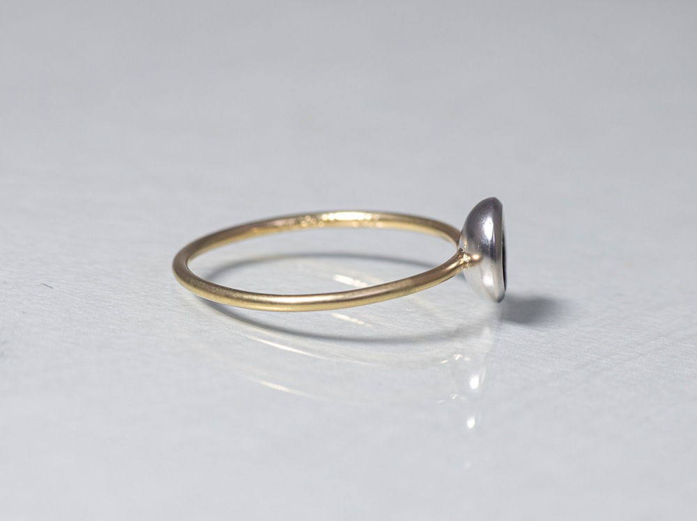 ダイヤモンドならではの輝きと自然の風合いを生かした、プラチナとゴールドのコンビが贅沢なリングです。石座の部分にPt900、リングの部分にK18YGを使用しています。スライスダイヤモンドだけが持つ原石の風合いとダイヤモンド特有の上品な輝きを活かすために、石座とリングはそれぞれマットに仕上げています。全体に華奢な造りでクリアな印象ですので、フォーマル使いにはもちろんのことカジュアル使いにもおすすめです。