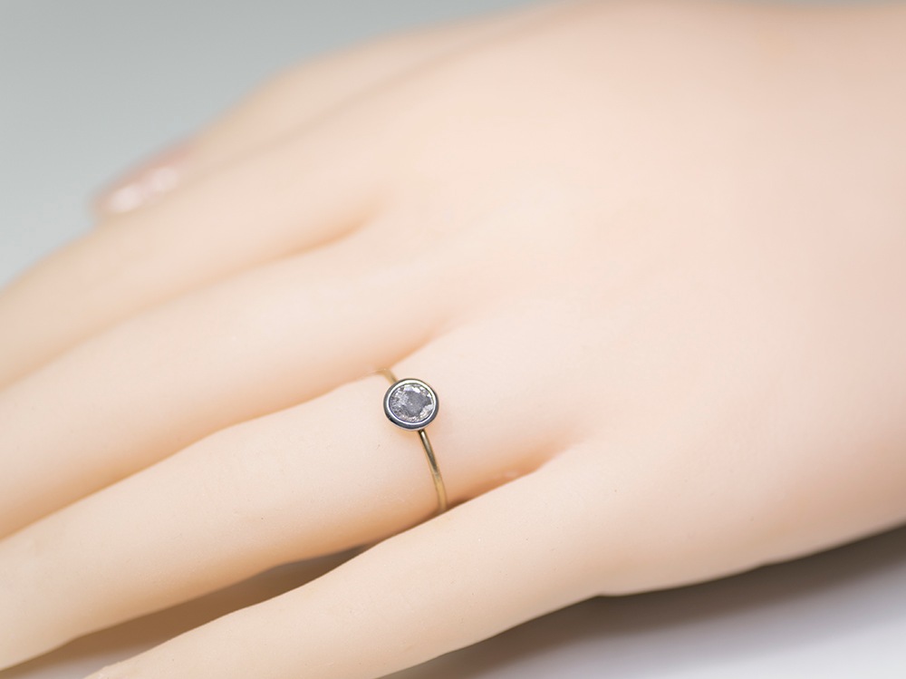 通常のダイヤモンドは無色透明なことが特徴ですが、スライスダイヤモンドは原石をそのままスライスし採掘したままの姿であるため内包物が見られます。それでいてカット表面の輝きはダイヤモンドそのもの。天然石ならではのたった一つの風合いとダイアモンドならではの美しさの両方を楽しめる石と言えます。このリングに使用しているスライスダイアモンドは黒い筋状の内包物と鉱物らしい白色の模様が見られ、これも「他にはふたつとしてない」魅力を感じます。