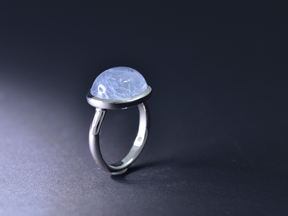 このリングに用いたデュモルチェライトインクォーツは8.55ctと大粒のカボションカット。透明度がとても高く細い繊維状の内包物が肉眼でもよく見られます。内包物のデュモルチェライトは淡い水色、重なり合う部分は濃いブルーグレーで、光をちらちらと反射してとても美しいです。