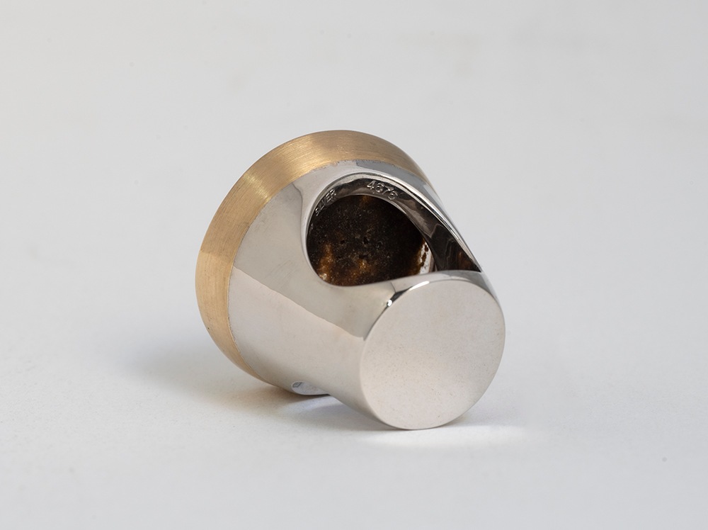 金属はK10YGとシルバーを使用しました。バイカラーがスタイリッシュです。石をしっかり支えながらも、指に当たるアーム部分の厚みにこだわって快適な装着感を実現しました。