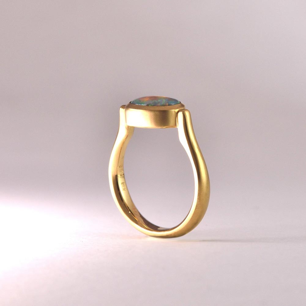 遊色が非常に美しいオパールを最大限に引き出す構造にデザインしたリングです。