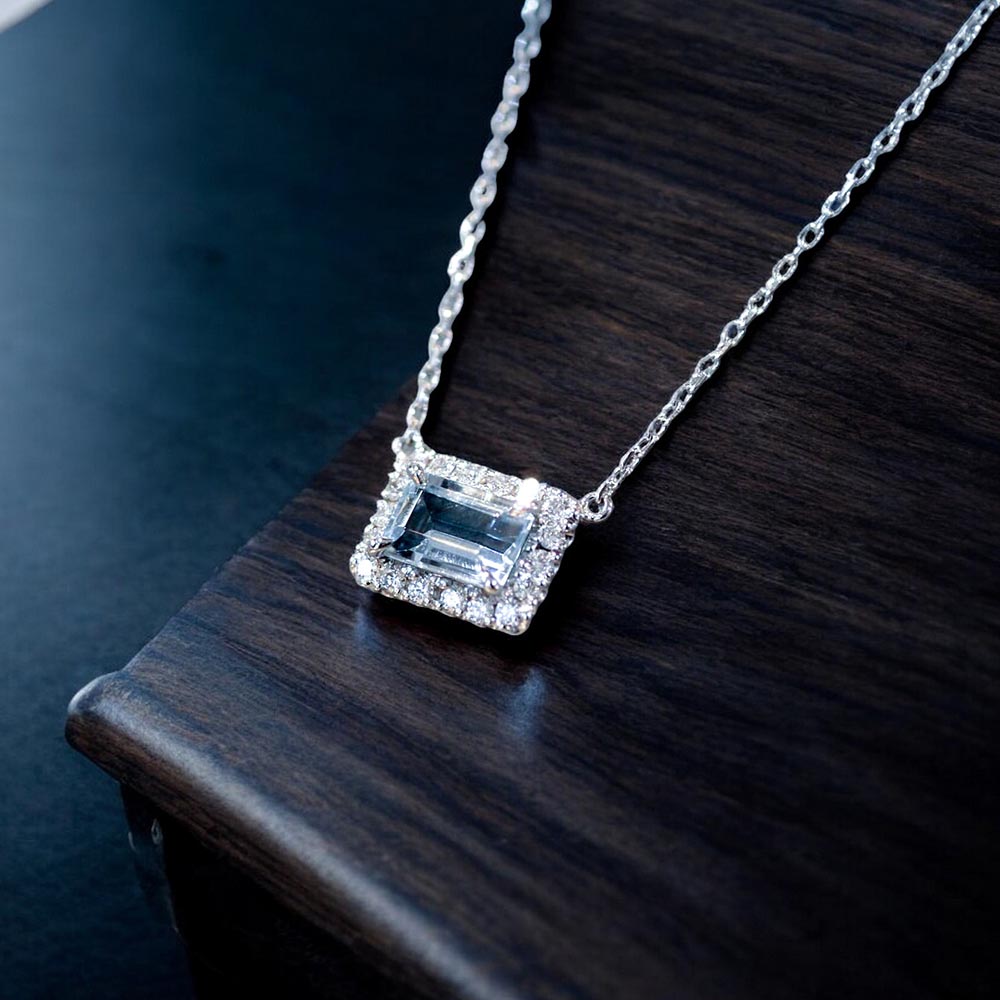 お客様からお預かりしたバゲットカットのアクアマリンを、「Procyon(プロキオン)」モデルで仕立てたネックレスです。冬のダイヤモンドシリーズの一つ、Procyonは、取り巻きのダイヤモンドがメインストーンの魅力を引き出します。