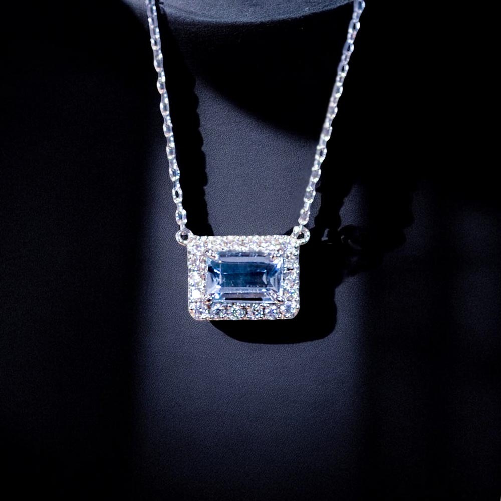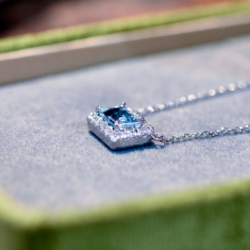 周囲を取り巻くメレダイヤモンドがプラチナとともにアクアマリンの青を一層際立たせ、シンプルながらも存在感のあるネックレスに仕上がりました。