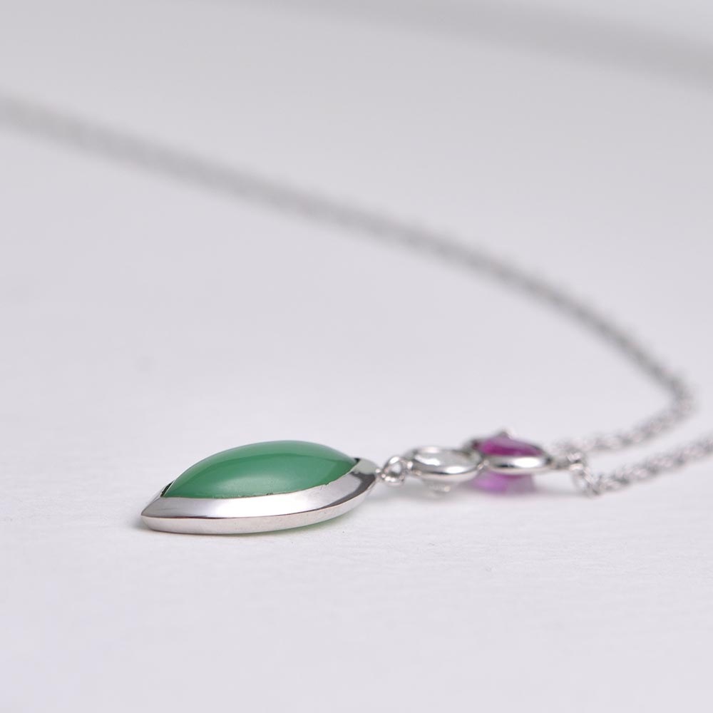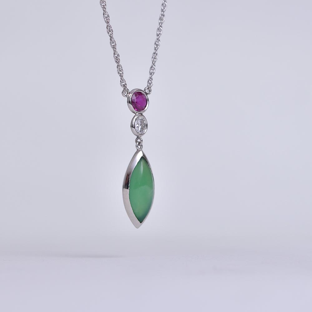 プラチナの冷たい輝きが各宝石の色彩を引き立て、統一感のある仕上がりに。思い出の品々が一つになったこのペンダントトップは、日常使いにもフォーマルなシーンにも映える、上品な存在感を放ちます。