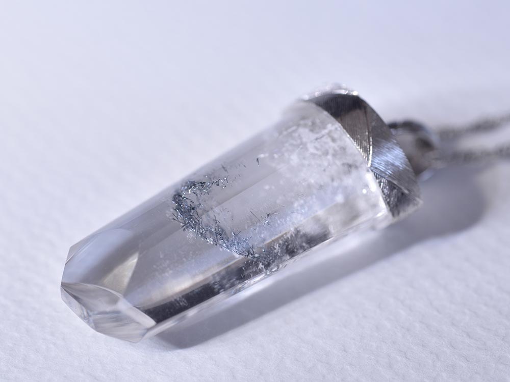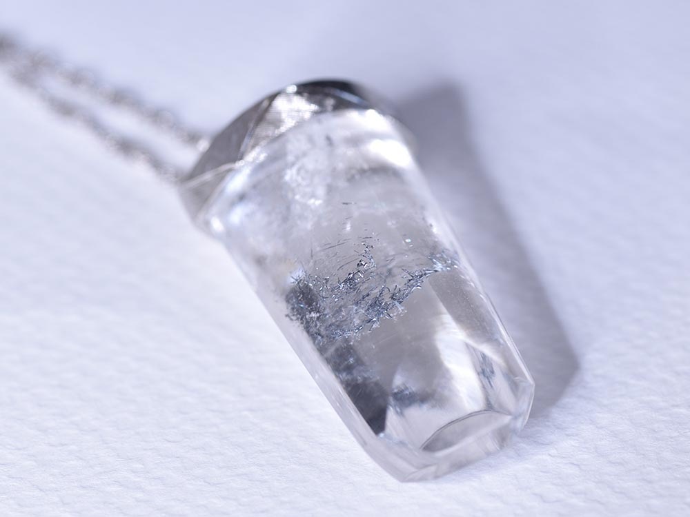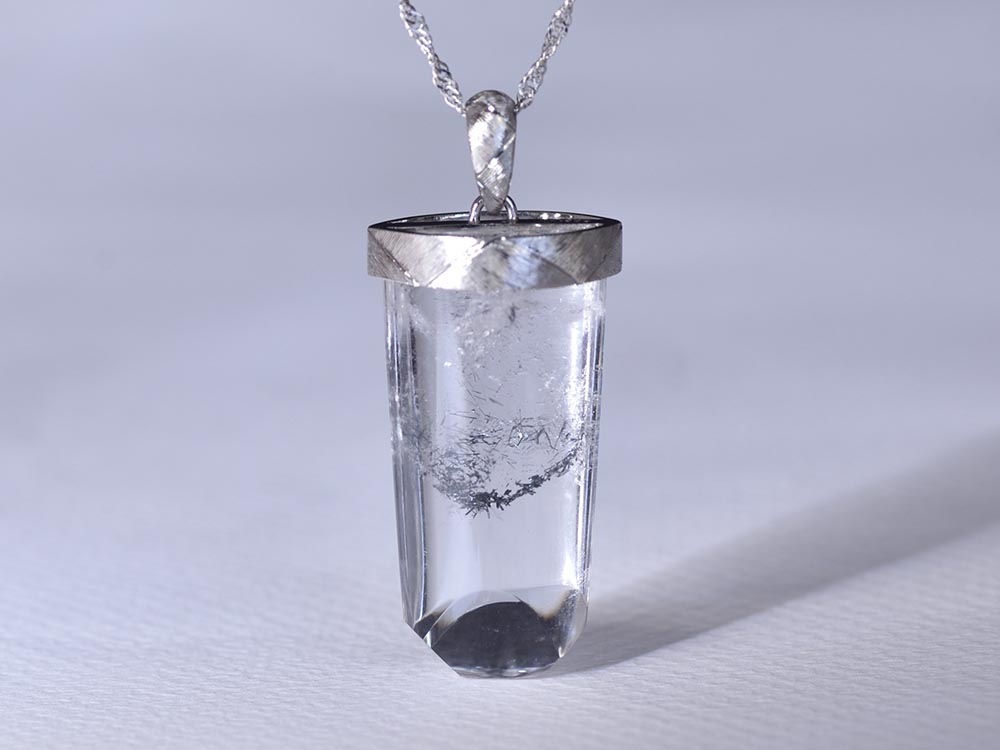 ヘマタイトの微細な結晶が、透明なクォーツの奥で星雲のようにきらめく34.26ct。澄み切った柱状のフォルムをそのまま生かし、〈stiria/スティーリア〉で端正に仕立てました。内に浮かぶ黒銀の煌めきと、外側のシャープな稜線。そのコントラストが胸元に凛とした存在感を与えます。