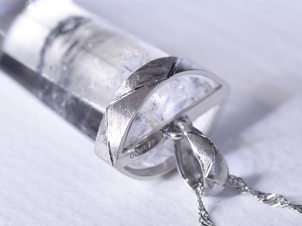 トップはPt900のキャップ&バチカン。細かなテクスチャーを施したメタルが氷面のように光を散らし、結晶の透明感をいっそう際立たせます。バチカン内径は6.0×3.5mmで、少し太めのチェーンやコードにも対応。装いをクールに引き締める、唯一無二の一点です。