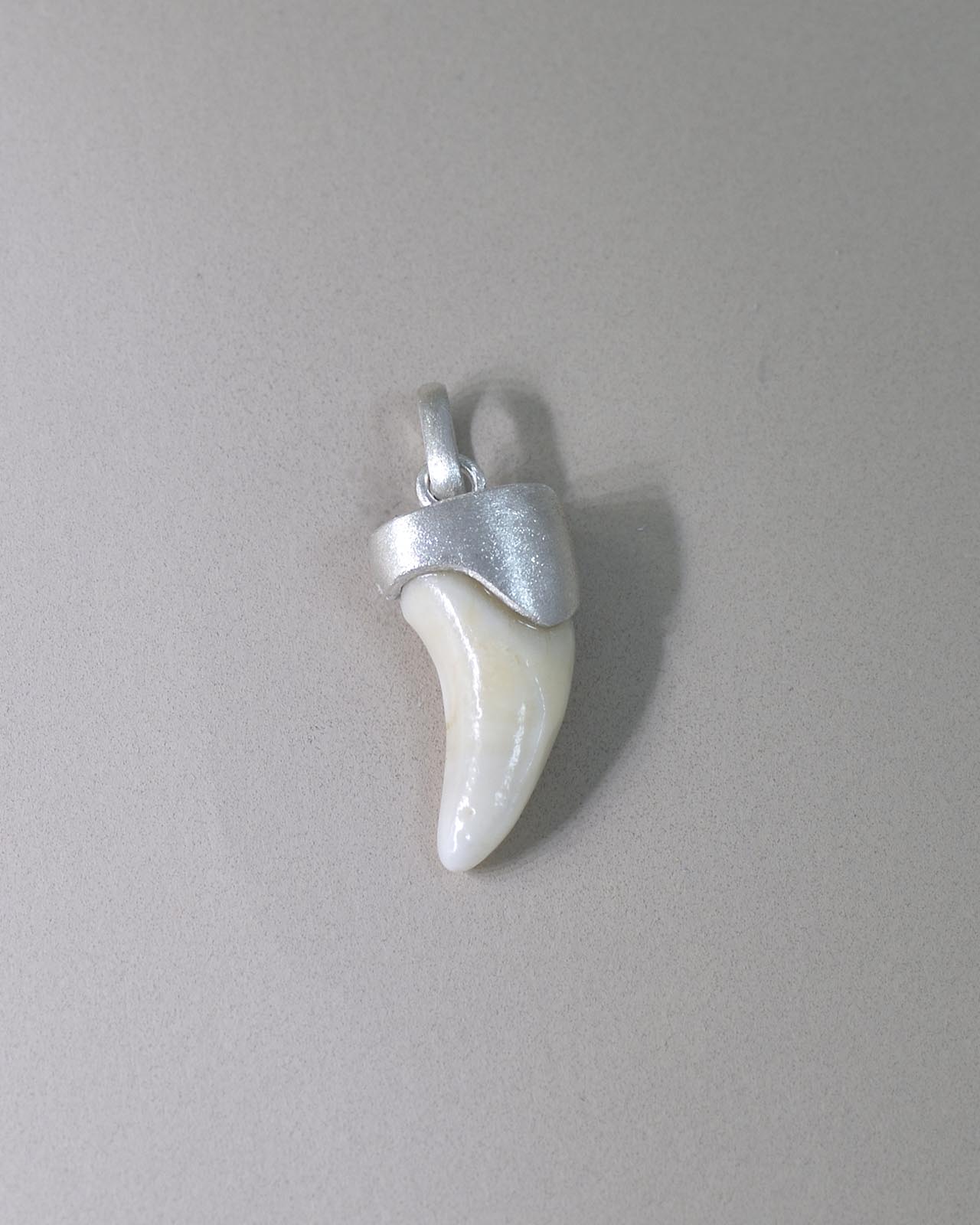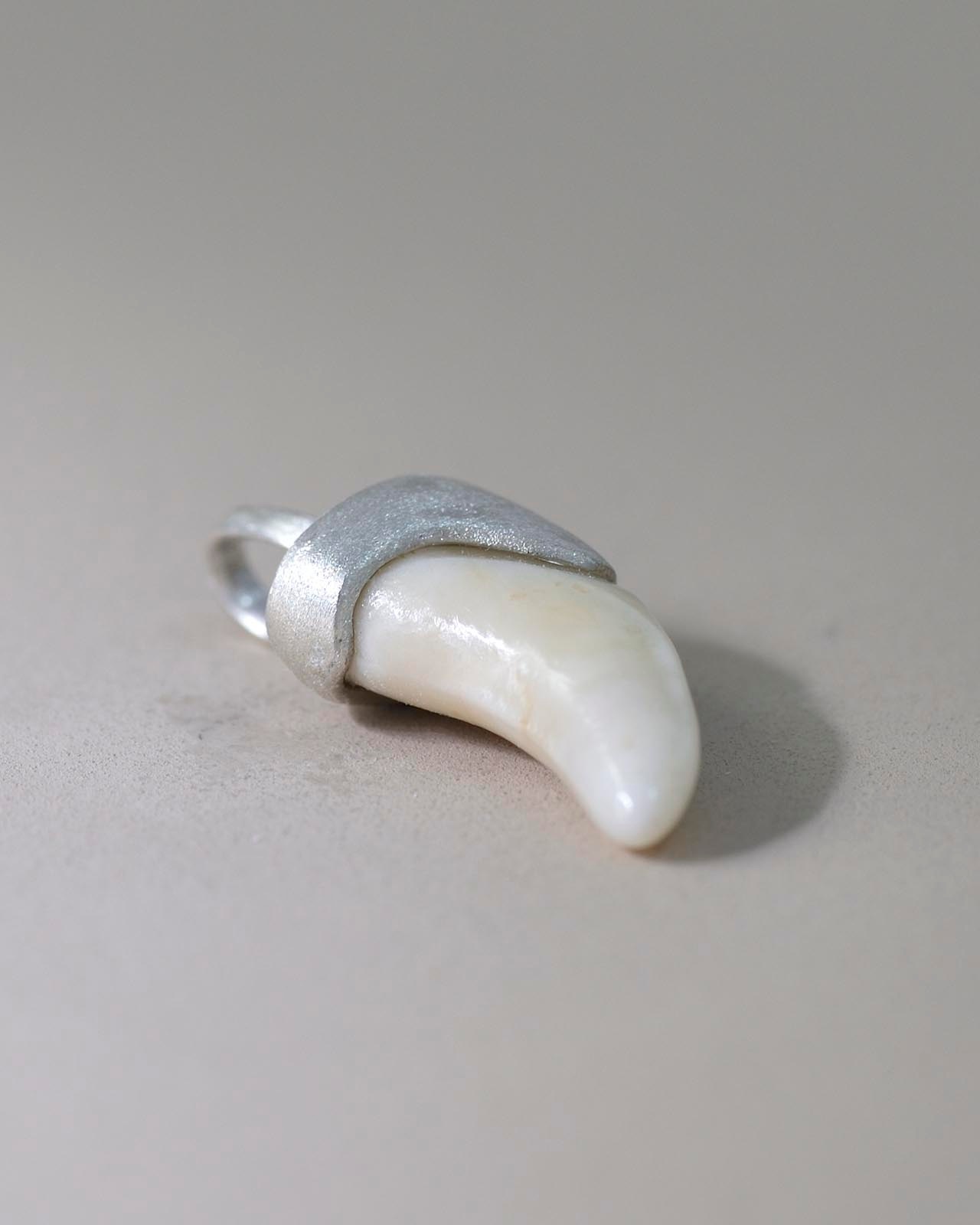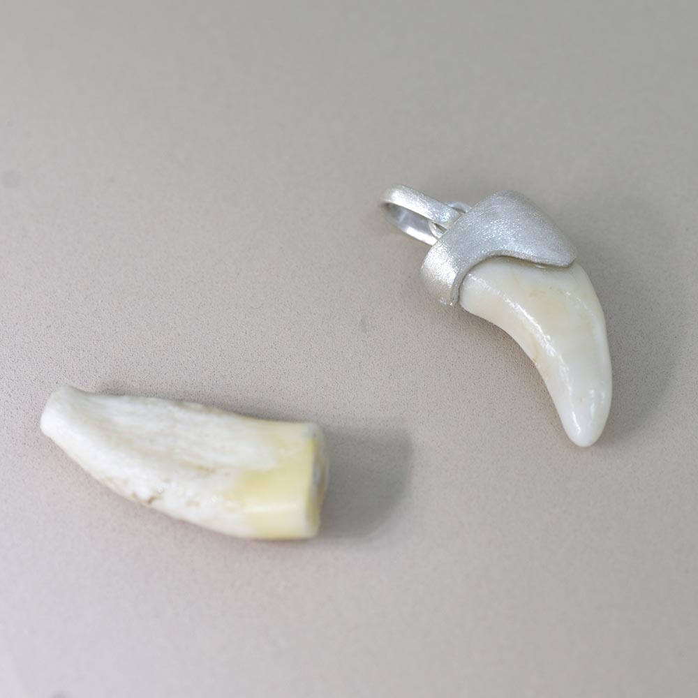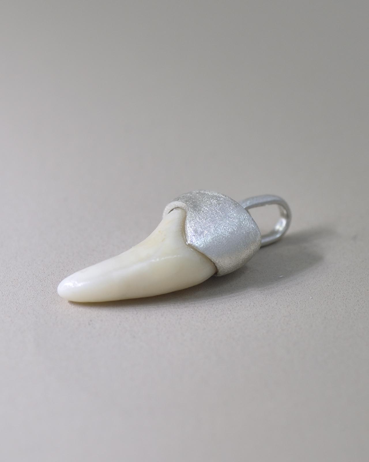 大切なご家族だったワンちゃんの歯をお持ち込みいただき、シルバーでペンダントトップに仕立てました。スティーリアの“キャップ”で包むデザインを活かしつつ、今回は歯のサイズを「歯茎から見えていた分」だけにカット。埋まっていた部分を省いて、日常で身につけやすいバランスに整えています。